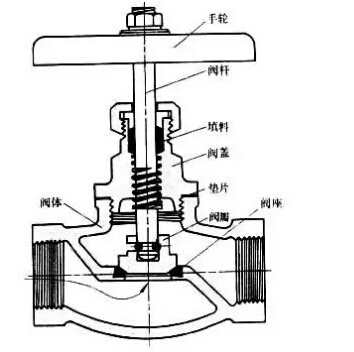 該類截止閥阿的閥桿螺紋直接與工作介質接觸,直接受介質的侵蝕,使閥桿螺紋易銹蝕、造成啟閉費力。此種結構的截止閥其公稱通經都比較小,一般在6~50mm之間,大部分用在儀表閥和取樣閥。